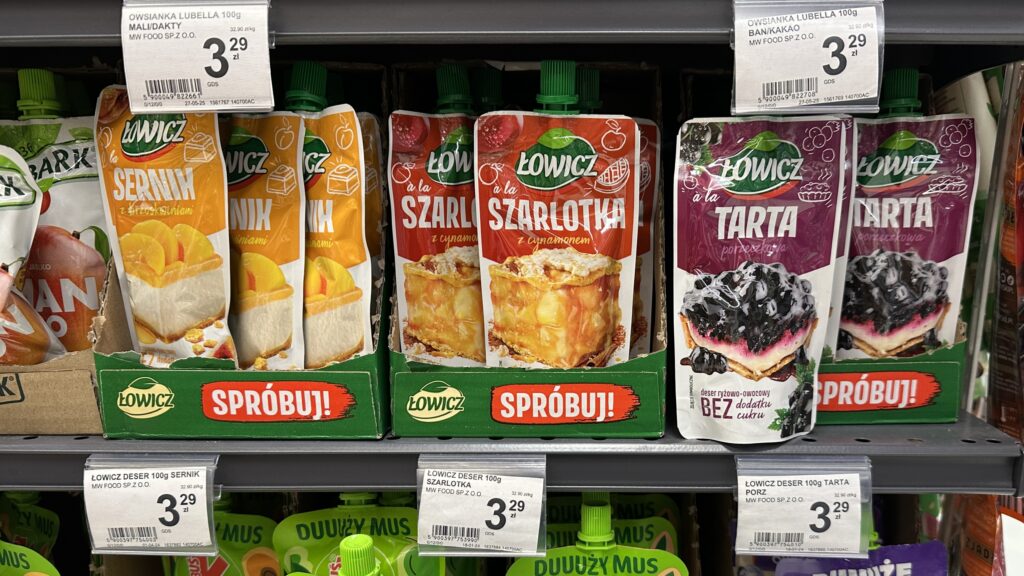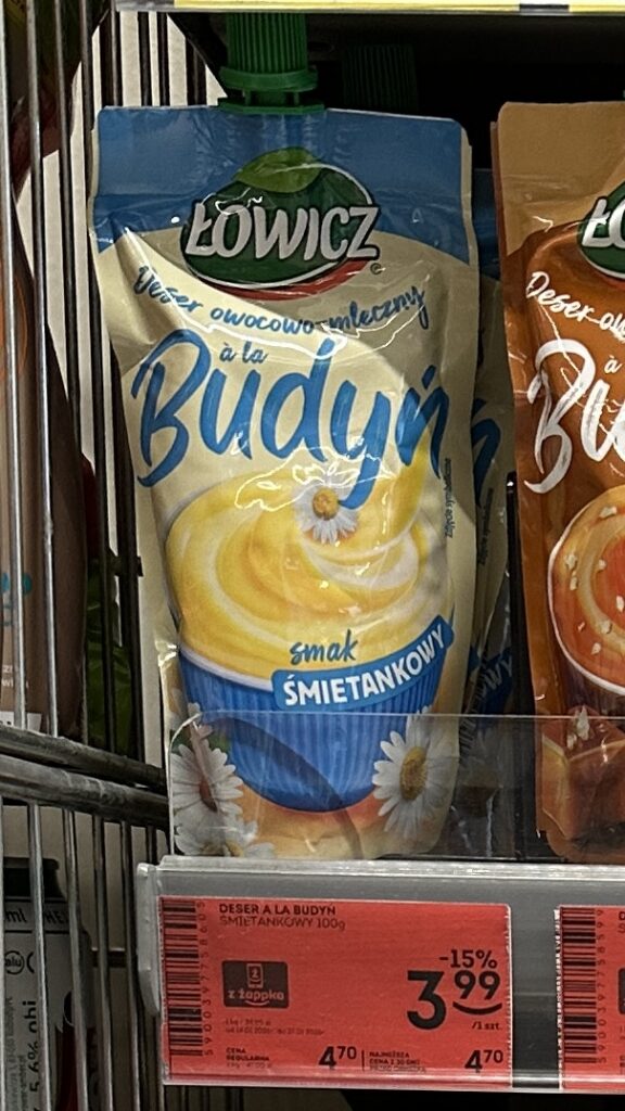 The latest evolution is the ready-to-eat pudding in a squeeze tube, like the Łowicz “à la Budyń” pictured. No kitchen, no extra ingredients, no skills, and zero cleanup. It is the ultimate “frictionless” food. You eat it on the way to the office or as a quick evening snack, and then the packaging vanishes into the bin. It’s a dessert for a life that doesn’t stop for a boiling pot.