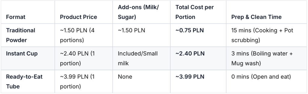 Moving from the traditional pot to the modern tube increases your cost per serving by over 430%. However, in a world where a “household” is often just one busy professional or one elderly person with limited energy, the market has decided that 15 minutes of your life is worth more than the 3.24 PLN price gap.